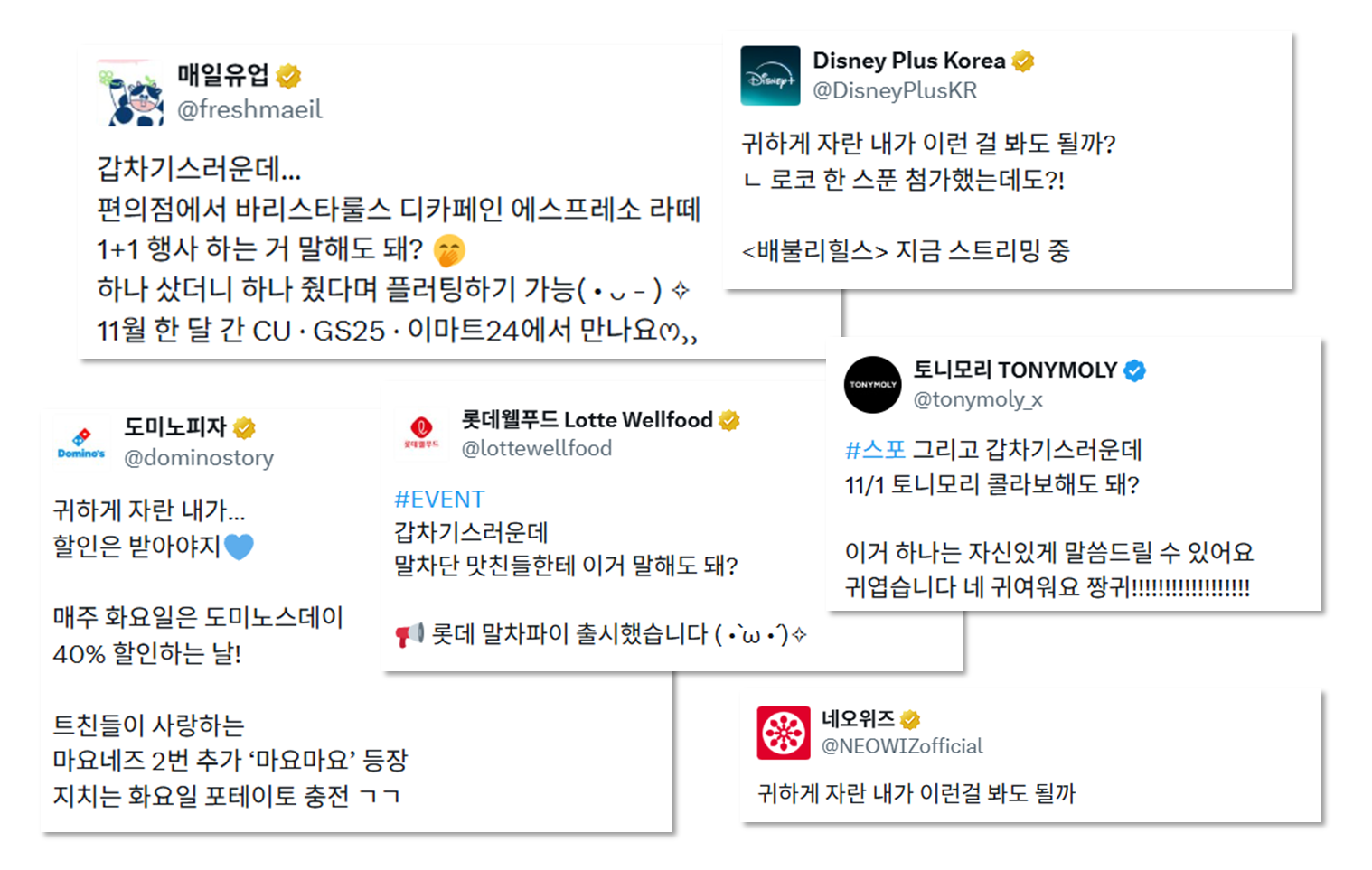 특히, 최근 유행했던 ‘귀하게 자란 내가 이런 걸 봐도 될까?’, ‘갑차기스러운데’처럼 커뮤니티에서 시작된 표현이 순식간에 SNS 전반으로 퍼지고, 다양한 브랜드의 공식 계정과 콘텐츠에 활용되며 하나의 유행어처럼 자리 잡는 모습도 볼 수 있었는데요.