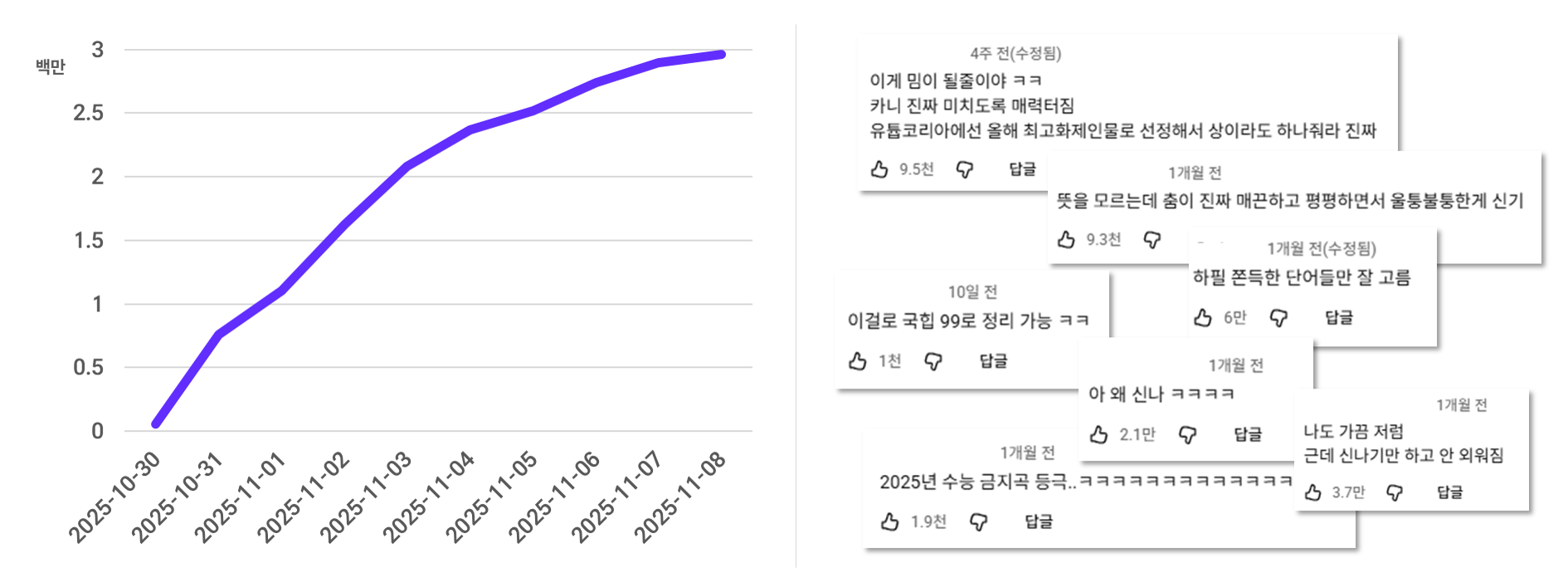 영상을 시청한 사람들 또한 ‘수능 금지곡 같다’, ‘느낌 좋다’, ‘계속 흥얼거리게 된다’와 같이 긍정적인 반응을 다수 남기며 콘텐츠가 짧은 시간 안에 하나의 유행으로 자리 잡게 되었습니다. |