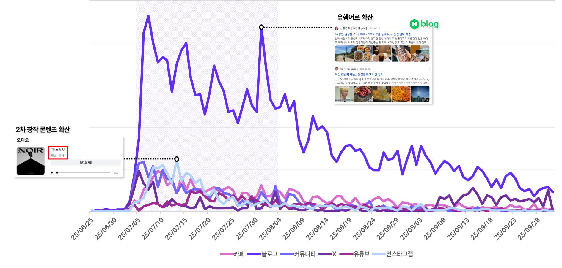 반면, 유튜브와 인스타그램, X(구 트위터)의 경우 숏폼 영상과 클립 공유를 중심으로 일정 수준의 버즈가 형성되었지만, 전체 언급량에서는 블로그 대비 상대적으로 낮은 비중을 차지하는 모습을 볼 수 있었어요. |
