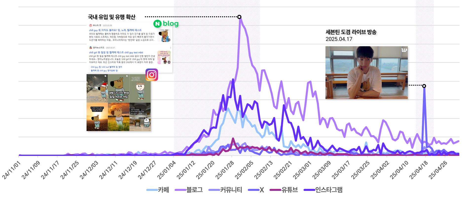 ↑’칠 가이’ 관련 채널별 버즈량 추이 (출처: TMCK DDA / 2024.11.01.~2025.05.01.)