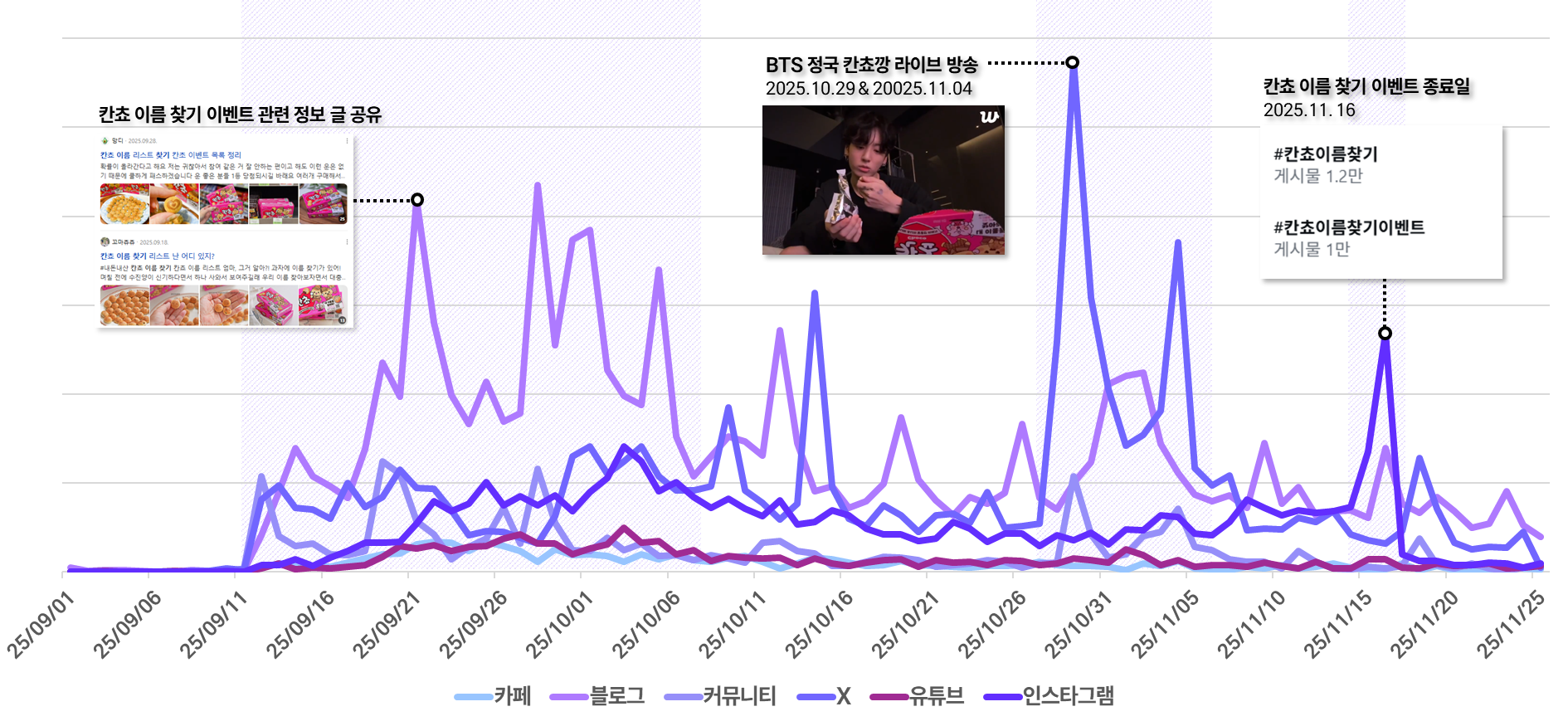 ↑’칸쵸 이름 찾기’ 관련 채널별 버즈량 추이 (출처: TMCK DDA / 2025.09.01.~2025.11.25.)