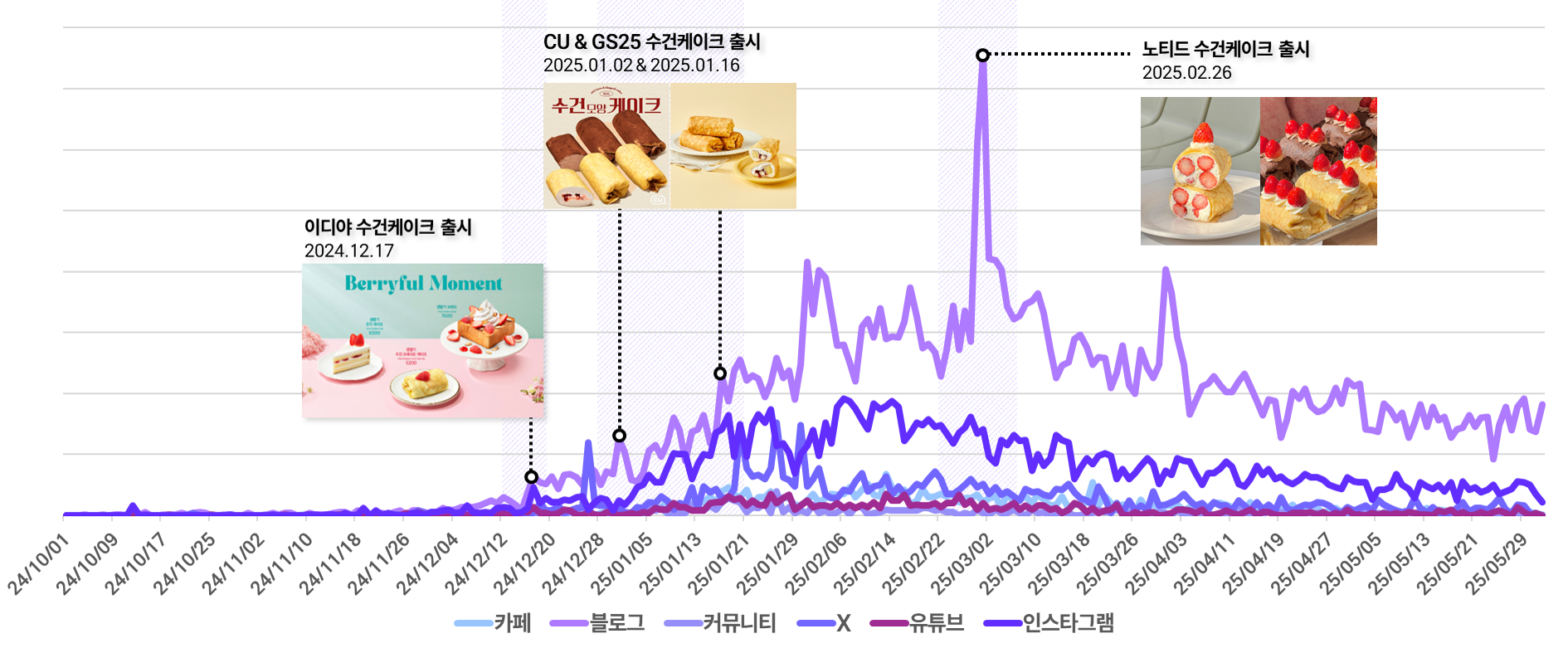 ↑’수건 케이크’ 관련 채널별 버즈량 추이 (출처: TMCK DDA / 2024.10.01.~2025.06.01.) |